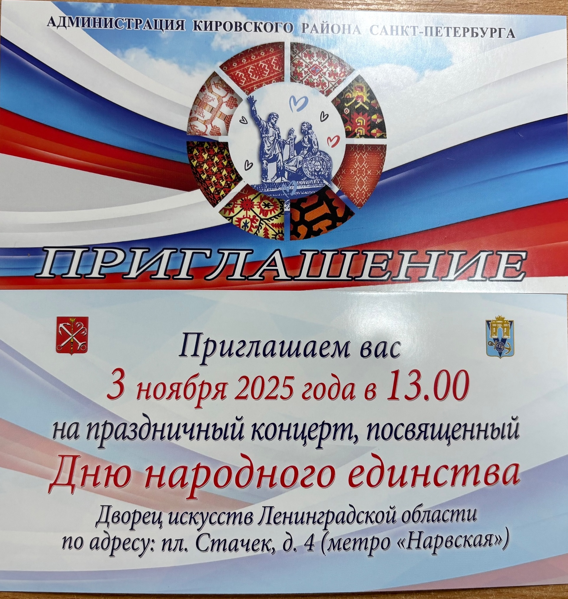 Приглашаем вас получить билеты на праздничный концерт, посвящённый Дню народного единства.