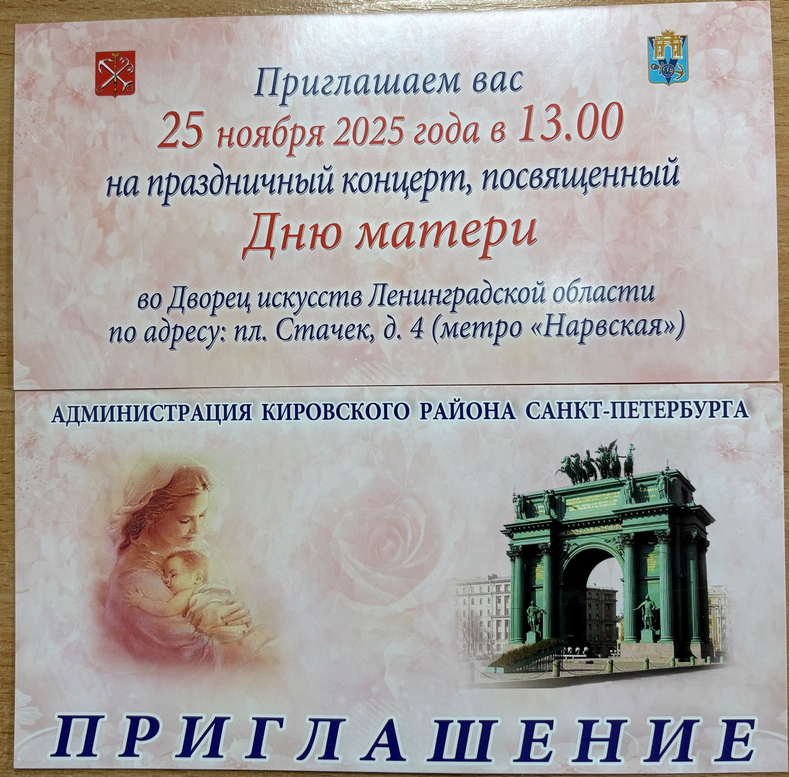 Приглашаем вас получить билеты на праздничный концерт, посвящённый Дню матери. Концерт состоится 25 ноября в 13.00 во Дворце искусств Ленинградской области (пл. Стачек, д. 4).