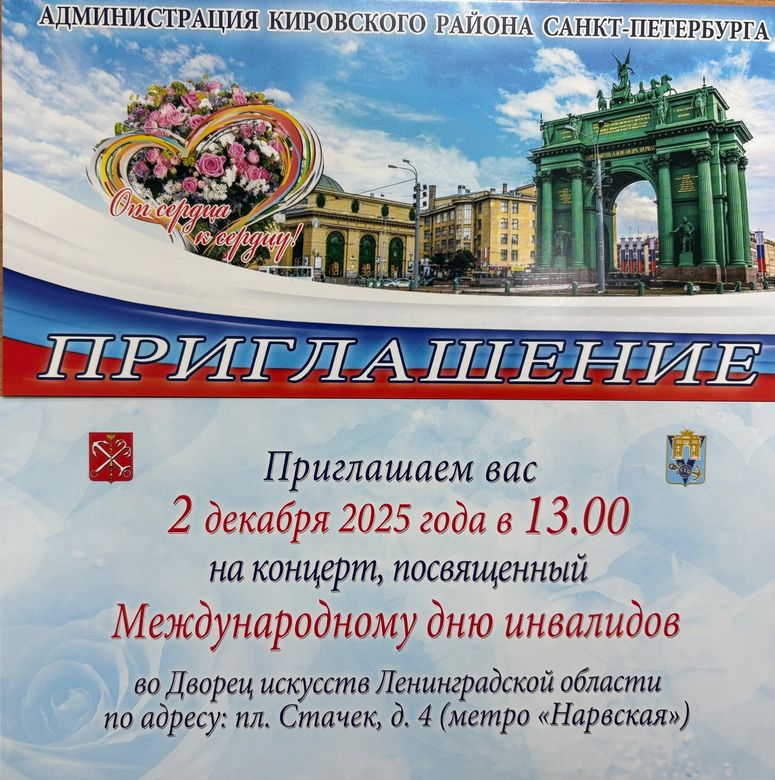 Приглашаем вас получить билеты на праздничный концерт, посвящённый Международному дню инвалидов. Концерт состоится 2 декабря в 13.00 во Дворце искусств Ленинградской области (пл. Стачек, д. 4).