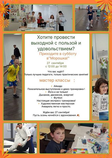 27 сентября 2025 года с 12.00 до 14.00 АНОДО «Школа Морошка», расположенная по адресу: Санкт-Петербург, пр. Ветеранов, д. 114, корп. 1, проводит праздник осени «Активная осень» и приглашает желающих посетить это мероприятие. Во время праздника будут проводиться мастер-классы для всех желающих (условия участия - заполнить небольшую анкету) по следующим направлениям: